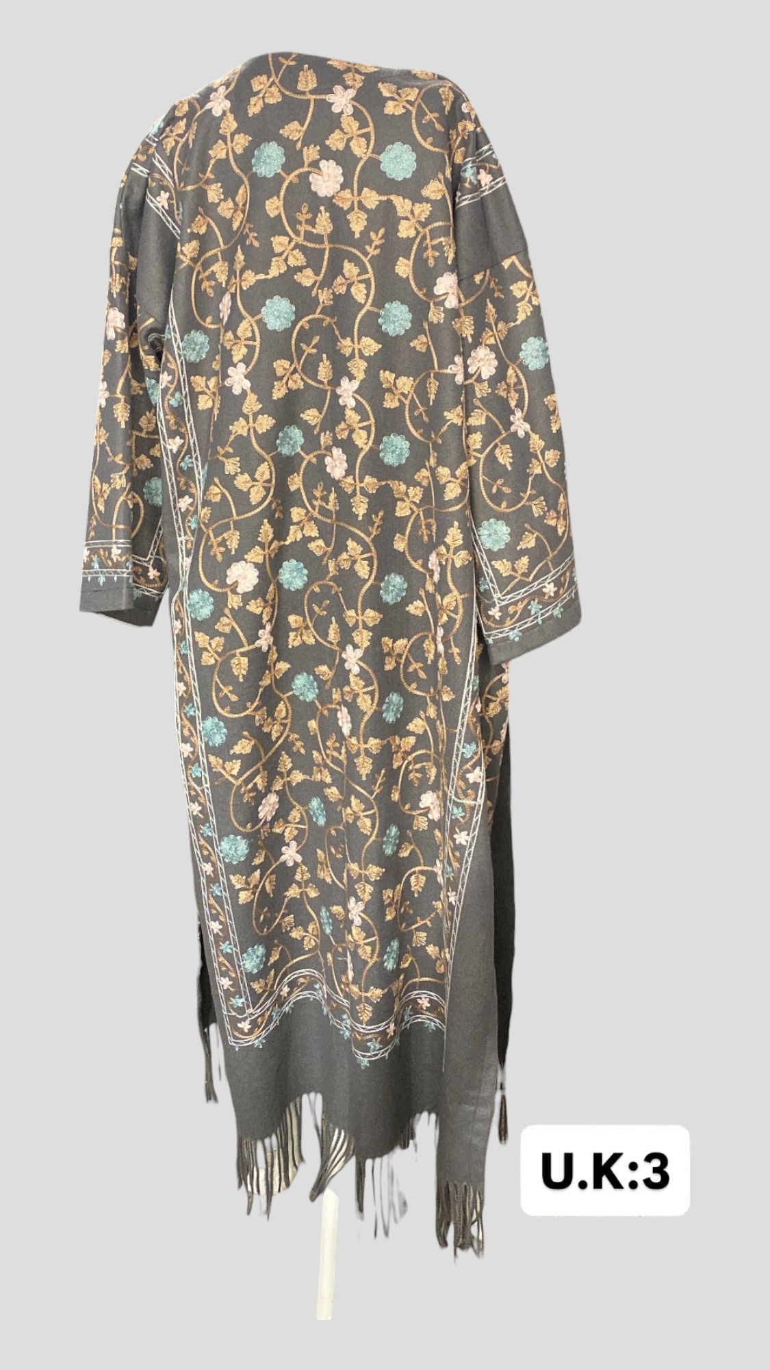 ÜRÜNÜMÜZ KAŞMİR ÜZERİNE SUZANİ İŞLEMELİDİR.ÜRÜNÜMÜZ OMUZ=65 KOL=39 BOY=117 EBATINDADIR.ÜRÜNÜMÜZÜN ALT KISIMLARI PÜSKÜLLÜDÜR.ÜRÜNÜMÜZ YIRTMAÇLIDIR.ÜRÜNÜMÜZ KUŞAKLIDIR.ÜRÜNÜMÜZÜN KOLLARI SAKAT KOL MODELİDİR.