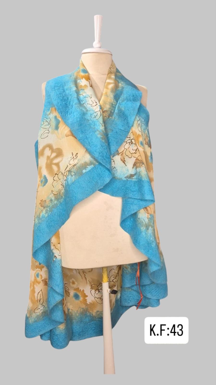 ÜRÜNÜMÜZÜN ORTASI İPEK ŞİFONDUR.ÜRÜNÜMÜZ KENARLARI KEÇEDİR.ÜRÜNÜMÜZ BOY= 110 GENİŞLİK=155 SIRT ARASI=25 EBATINDADIR.ILIK SU VE ŞAMPUAN İLE ELDE YIKAMA YAPINIZ.ÜRÜNLERİMİZ SINIRLI STOKLARDA ÜRETİLMİŞTİR.