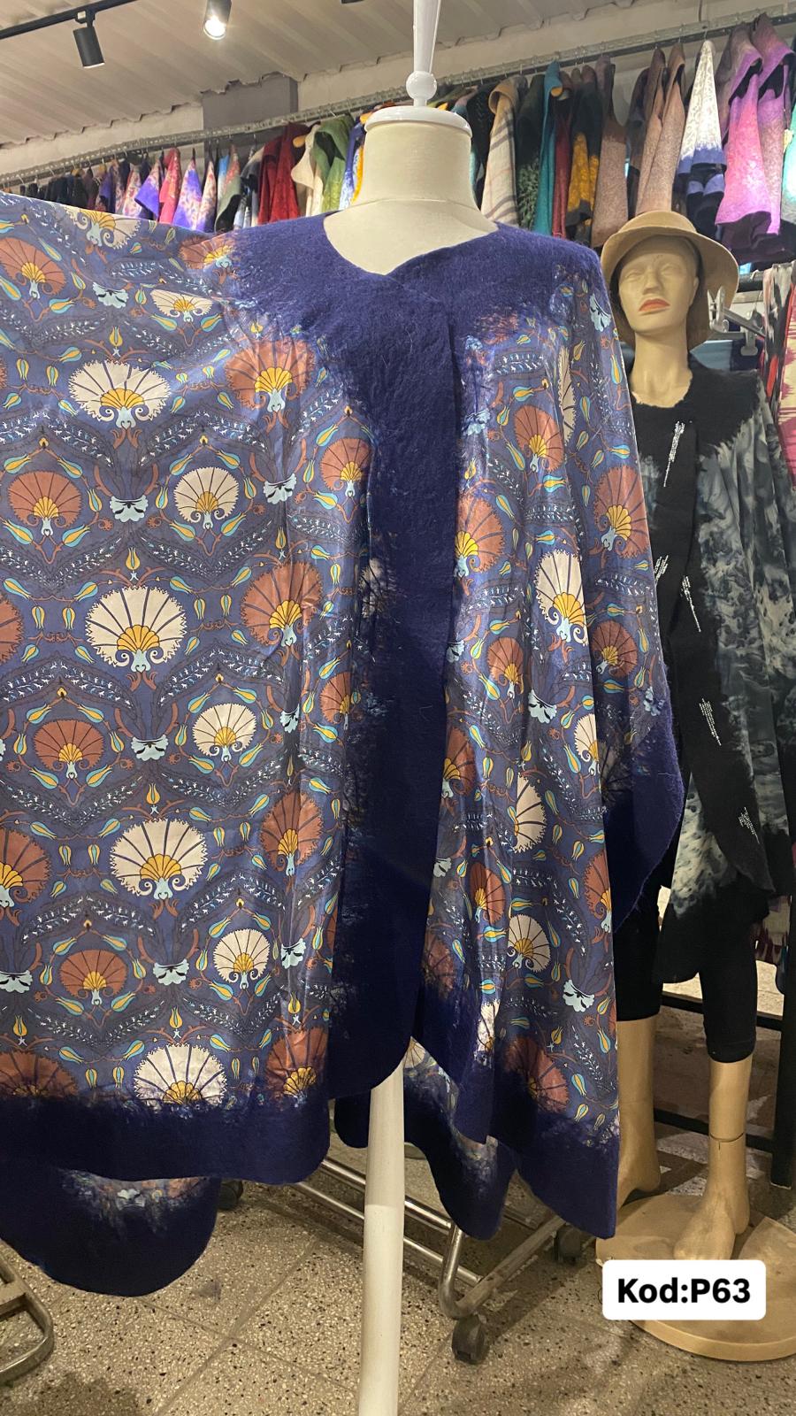 Keçe pançolarımızı 20-24 mikyon yünlerden elde üretilmiştir Vual nefes alan kumaştır Dijital baskı ile kumaş tasarım desenler kullanılmıştır Pançonun sadece kenar kısımları keçeleştirilireke üretilmiştir Standart bedendir.Omuz =42 Boy=95 ölçüsündedir.