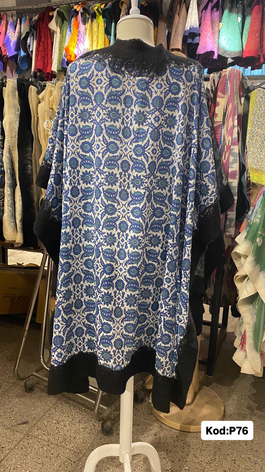 Keçe pançolarımızı 20-24 mikyon yünlerden elde üretilmiştir Vual nefes alan kumaştır Dijital baskı ile kumaş tasarım desenler kullanılmıştır Pançonun sadece kenar kısımları keçeleştirilireke üretilmiştir Standart bedendir.Omuz =42 Boy=101 ölçüsündedir