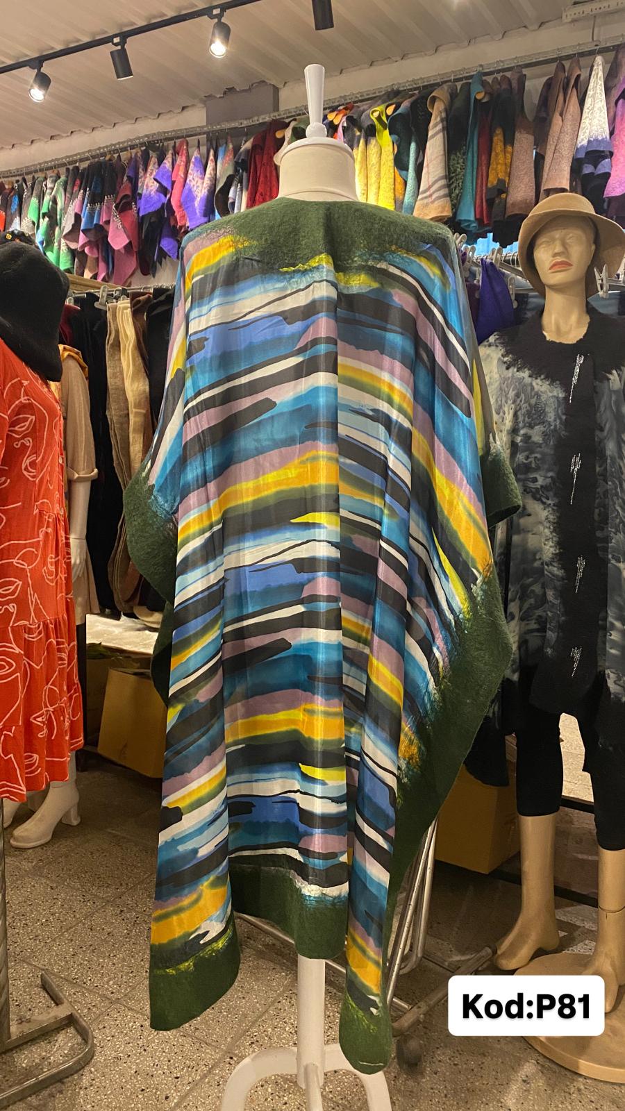 Keçe pançolarımızı 20-24 mikyon yünlerden elde üretilmiştir Vual nefes alan kumaştır Dijital baskı ile kumaş tasarım desenler kullanılmıştır Pançonun sadece kenar kısımları keçeleştirilireke üretilmiştir Standart bedendir.Omuz =42 Boy=101 ölçüsündedir