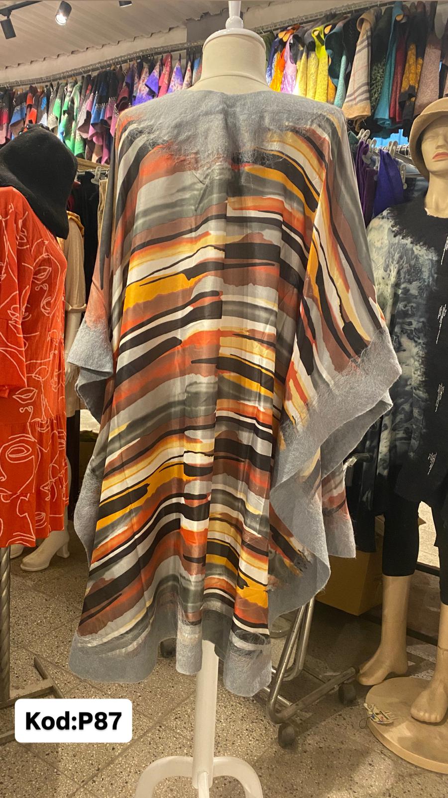 Keçe pançolarımızı 20-24 mikyon yünlerden elde üretilmiştir Vual nefes alan kumaştır Dijital baskı ile kumaş tasarım desenler kullanılmıştır Pançonun sadece kenar kısımları keçeleştirilireke üretilmiştir Standart bedendir.Omuz =42 Boy=101 ölçüsündedir