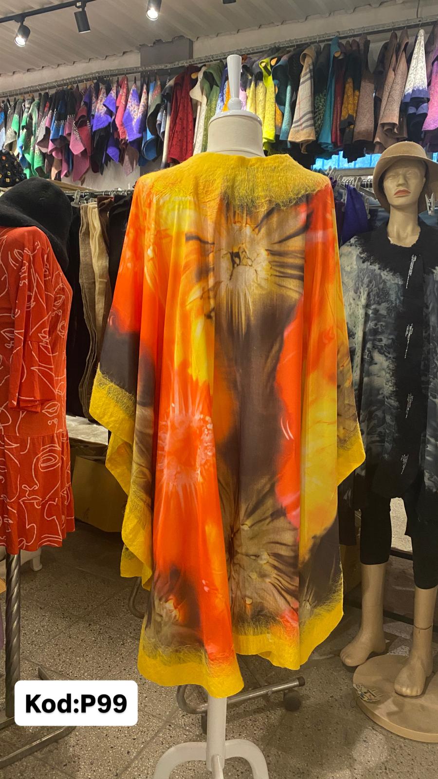 Keçe pançolarımızı 20-24 mikyon yünlerden elde üretilmiştir Vual nefes alan kumaştır Dijital baskı ile kumaş tasarım desenler kullanılmıştır Pançonun sadece kenar kısımları keçeleştirilireke üretilmiştir Standart bedendir.Omuz =42 Boy=101 ölçüsündedir