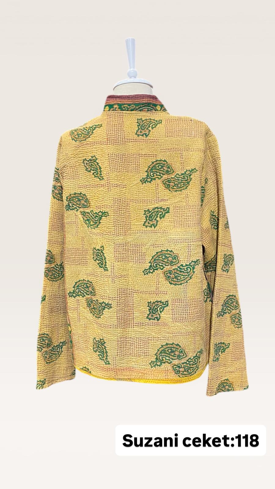 ÜRÜNLERİMİZ İPEK SUZANİDİR. ÜRÜNÜMÜZ ÖLÇÜLERİ OMUZ=37 BOY=61 KOL=59 EBATINDADIR.ÜRÜNÜMÜZDE ÇİFT CEP BULUNMAKTADIR. EL YAPIMI ESKİ KUMAŞLARDAN ÜRETİLMİŞTİR.ÜRÜNÜMÜZ KİŞİYE ÖZEL TASARIMDIR.