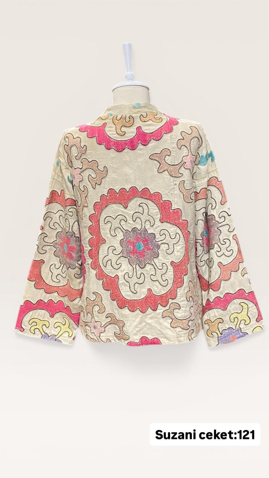 ÜRÜNLERİMİZ İPEK SUZANİDİR. ÜRÜNÜMÜZ ÖLÇÜLERİ OMUZ=41 BOY=59 KOL=59 EBATINDADIR.ÜRÜNÜMÜZ ÇİFT CEPLİDİR.ÜRÜNÜMÜZ ASTARLIDIR.EL YAPIMI ESKİ KUMAŞLARDAN ÜRETİLMİŞTİR.ÜRÜNÜMÜZ KİŞİYE ÖZEL TASARIMDIR.