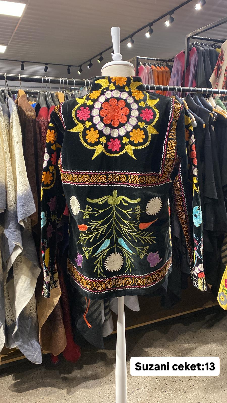 ÜRÜNLERİMİZ İPEK SUZANİDİR. ÜRÜNÜMÜZ ÖLÇÜLERİ OMUZ=42 BOY=61 KOL=57 EBATINDADIR.ÜRÜNÜMÜZ ÇİFT CEPLİDİR.ÜRÜNÜMÜZ ASTARLIDIR.EL YAPIMI ESKİ KUMAŞLARDAN ÜRETİLMİŞTİR.ÜRÜNÜMÜZ KİŞİYE ÖZEL TASARIMDIR.