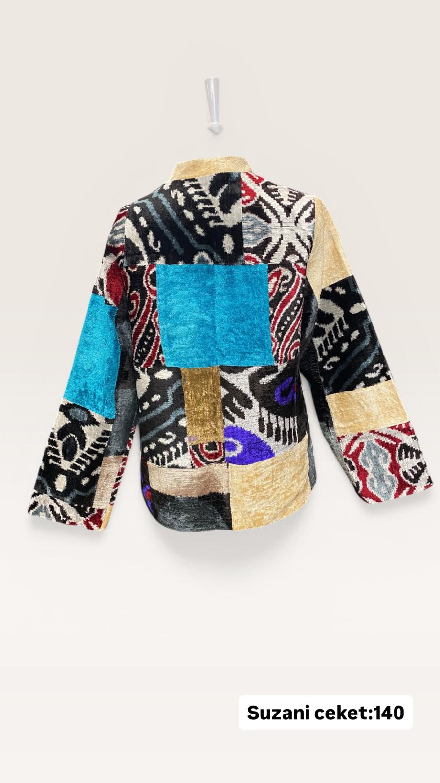 ÜRÜNLERİMİZ İPEK SUZANİDİR. ÜRÜNÜMÜZ ÖLÇÜLERİ OMUZ=41 BOY=73 KOL=46 EBATINDADIR.ÜRÜNÜMÜZ ASTARLIDIR.EL YAPIMI ESKİ KUMAŞLARDAN ÜRETİLMİŞTİR. ÜRÜNÜMÜZ KİŞİYE ÖZEL TASARIMDIR. ürün çok eski kumaşlardan kırkyama yapılarak sonra ceketolrak tasarlanmıştır
