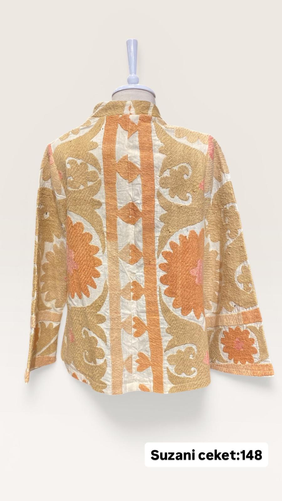 ÜRÜNLERİMİZ İPEK SUZANİDİR. ÜRÜNÜMÜZ ÖLÇÜLERİ OMUZ=40 BOY=76 KOL=58 EBATINDADIR.ÜRÜNÜMÜZ ASTARLIDIR.ÜRÜNÜMÜZ ÇİFT CEPLİDİR.EL YAPIMI ESKİ KUMAŞLARDAN ÜRETİLMİŞTİR.ÜRÜNÜMÜZ KİŞİYE ÖZEL TASARIMDIR.