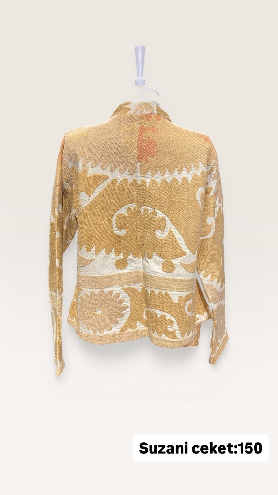 ÜRÜNLERİMİZ İPEK SUZANİDİR. ÜRÜNÜMÜZ ÖLÇÜLERİ OMUZ=40 BOY=76 KOL=58 EBATINDADIR.ÜRÜNÜMÜZ ASTARLIDIR.ÜRÜNÜMÜZ ÇİFT CEPLİDİR.EL YAPIMI ESKİ KUMAŞLARDAN ÜRETİLMİŞTİR.ÜRÜNÜMÜZ KİŞİYE ÖZEL TASARIMDIR.
