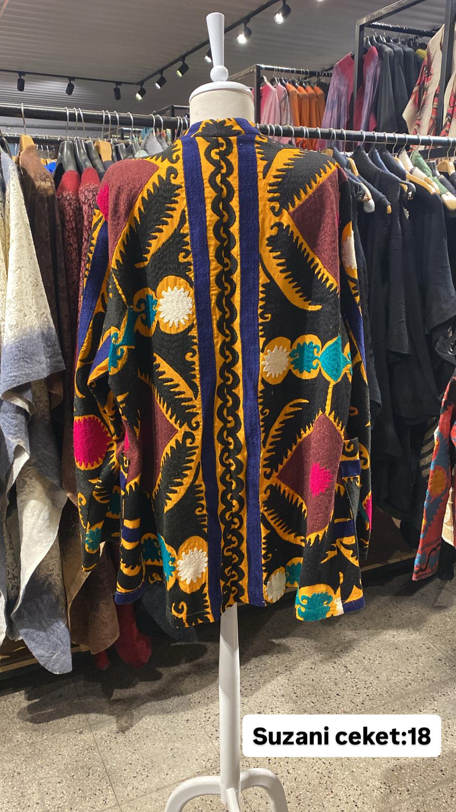 ÜRÜNLERİMİZ İPEK SUZANİDİR. ÜRÜNÜMÜZ ÖLÇÜLERİ OMUZ=40 BOY=76 KOL=58 EBATINDADIR.ÜRÜNÜMÜZ ASTARLIDIR.ÜRÜNÜMÜZ ÇİFT CEPLİDİR.EL YAPIMI ESKİ KUMAŞLARDAN ÜRETİLMİŞTİR.ÜRÜNÜMÜZ KİŞİYE ÖZEL TASARIMDIR.