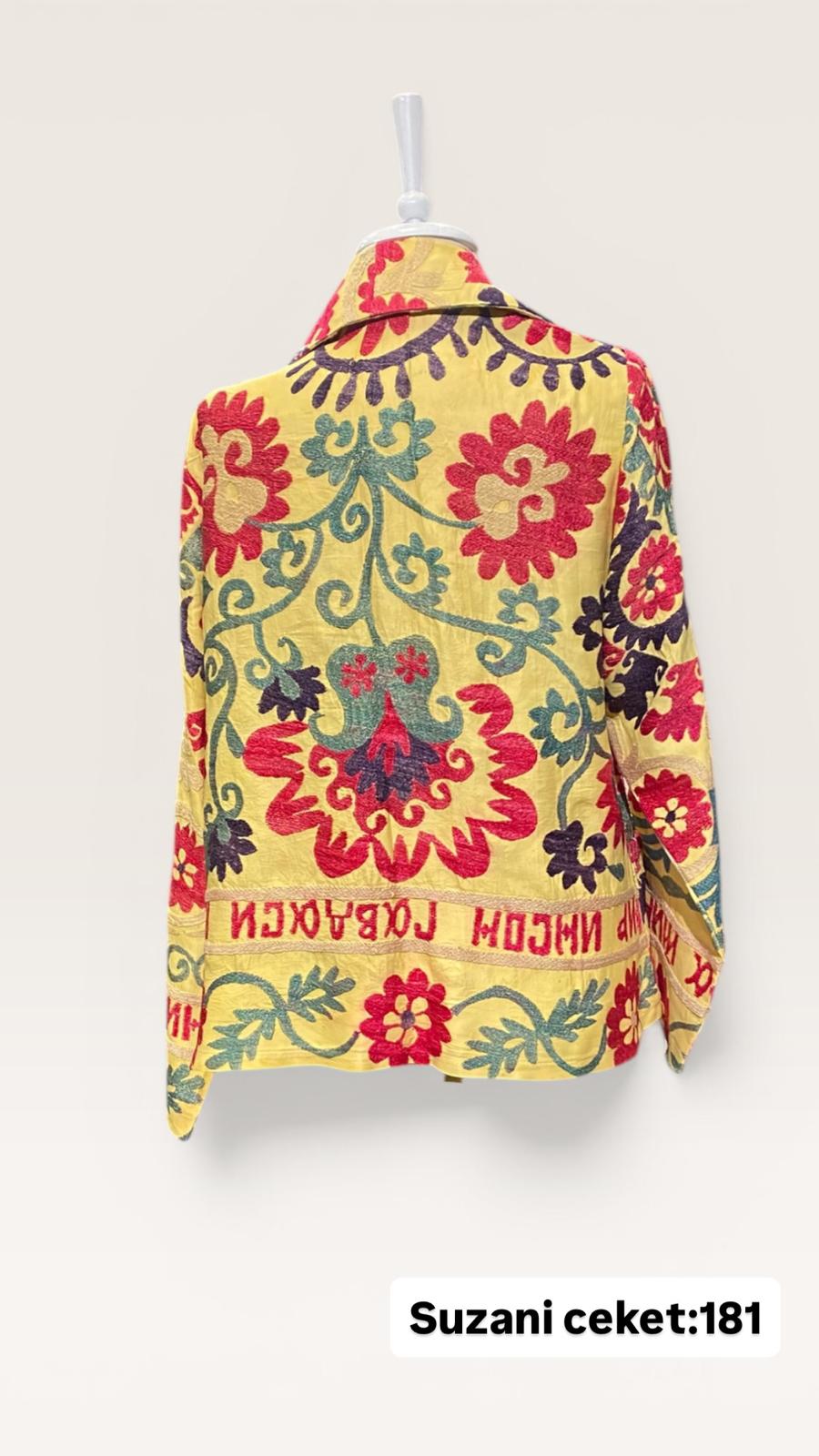 ÜRÜNLERİMİZ İPEK SUZANİDİR. ÜRÜNÜMÜZ ÖLÇÜLERİ OMUZ=41 BOY=59 KOL=59 EBATINDADIR.ÜRÜNÜMÜZ ÇİFT CEPLİDİR.ÜRÜNÜMÜZ ASTARLIDIR.EL YAPIMI ESKİ KUMAŞLARDAN ÜRETİLMİŞTİR.ÜRÜNÜMÜZ KİŞİYE ÖZEL TASARIMDIR.