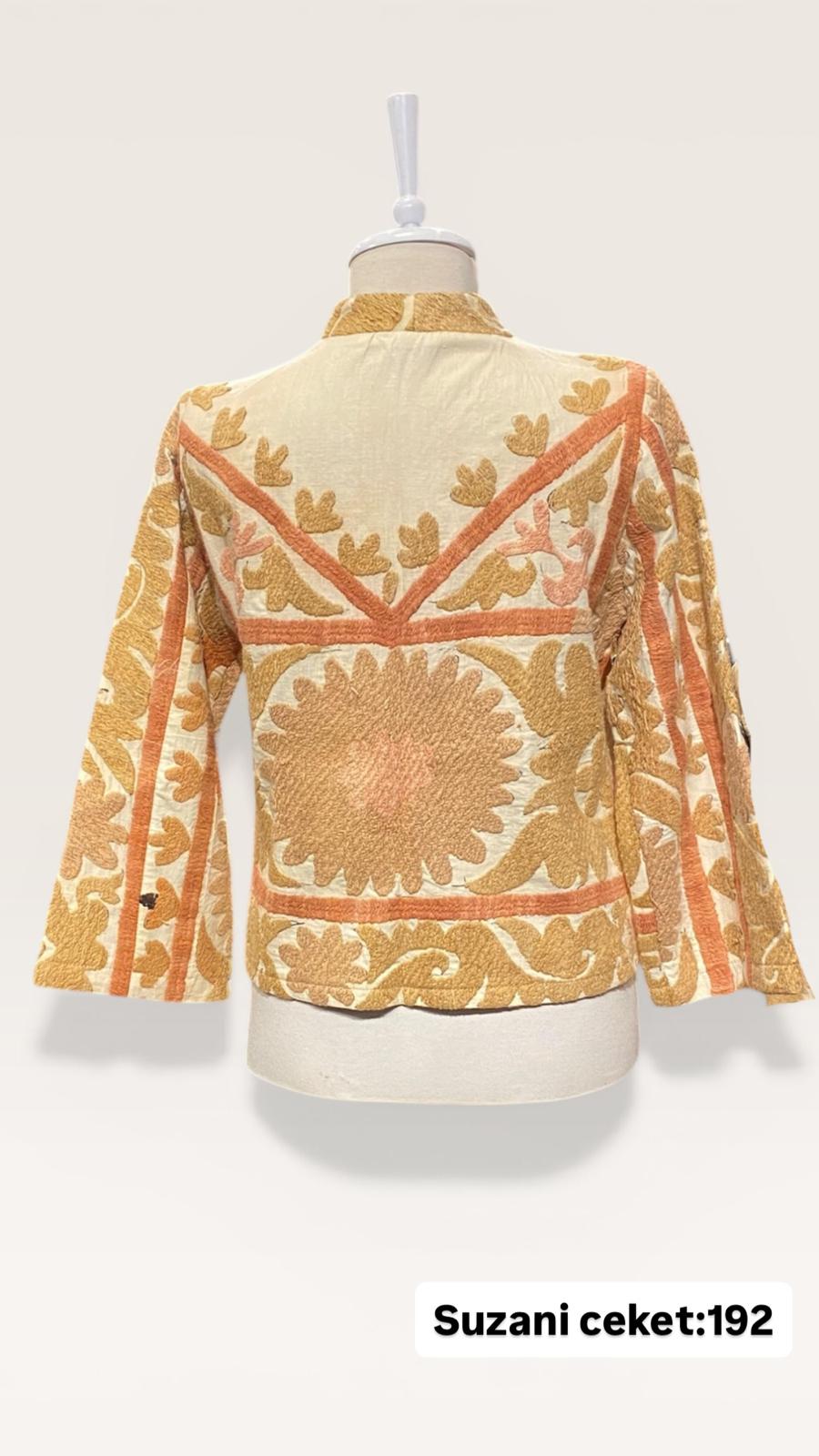 ÜRÜNLERİMİZ İPEK SUZANİDİR. ÜRÜNÜMÜZ ÖLÇÜLERİ OMUZ=41 BOY=73 KOL=46 EBATINDADIR.ÜRÜNÜMÜZ ASTARLIDIR.EL YAPIMI ESKİ KUMAŞLARDAN ÜRETİLMİŞTİR. ÜRÜNÜMÜZ KİŞİYE ÖZEL TASARIMDIR. ürün çok eski kumaşlardan kırkyama yapılarak sonra ceketolrak tasarlanmıştır