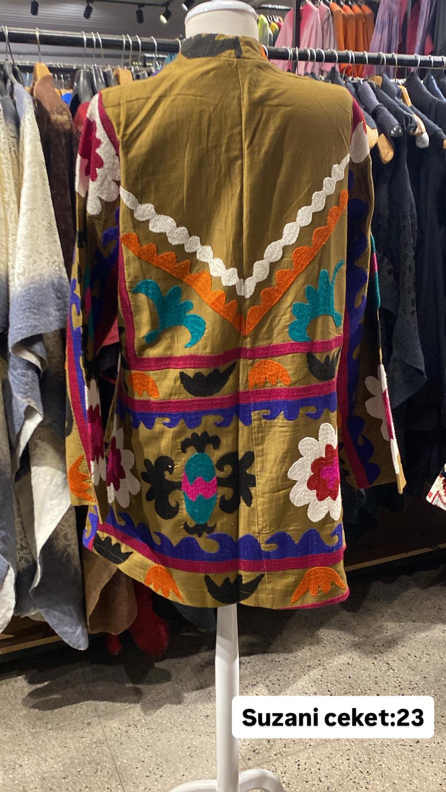 ÜRÜNLERİMİZ İPEK SUZANİDİR. ÜRÜNÜMÜZ ÖLÇÜLERİ OMUZ=42 BOY=56 KOL=59 EBATINDADIR.ÜRÜNÜMÜZ ÇİFT CEPLİDİR.ÜRÜNMÜZ ASTARLIDIR.EL YAPIMI ESKİ KUMAŞLARDAN ÜRETİLMİŞTİR.ÜRÜNÜMÜZ KİŞİYE ÖZEL TASARIMDIR.