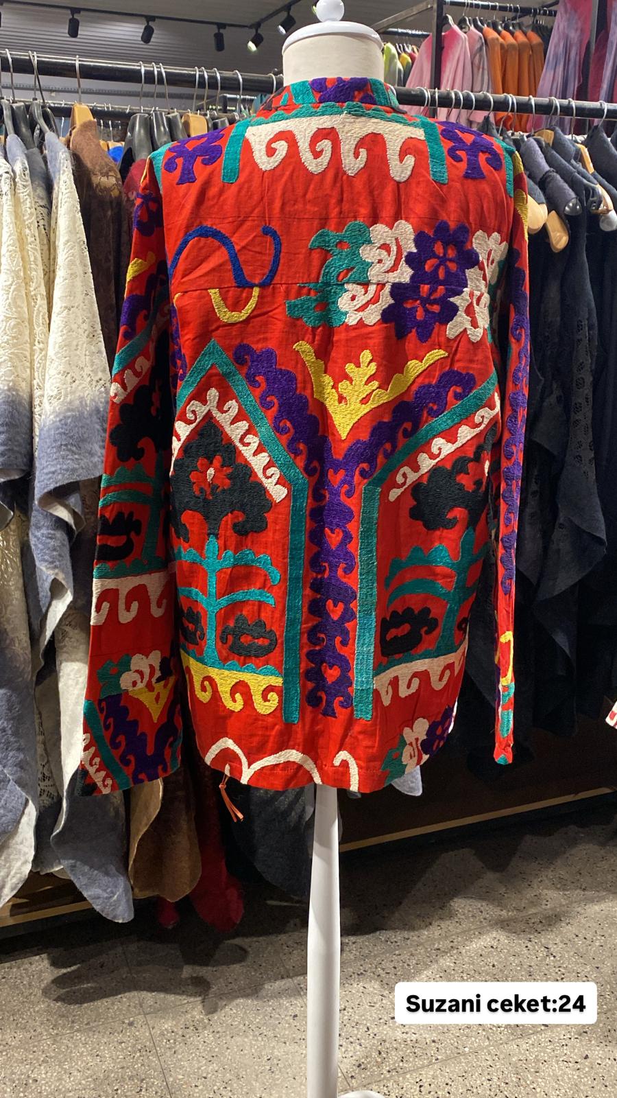 ÜRÜNLERİMİZ İPEK SUZANİDİR. ÜRÜNÜMÜZ ÖLÇÜLERİ OMUZ=40 BOY=76 KOL=58 EBATINDADIR.ÜRÜNÜMÜZ ASTARLIDIR.ÜRÜNÜMÜZ ÇİFT CEPLİDİR.EL YAPIMI ESKİ KUMAŞLARDAN ÜRETİLMİŞTİR.ÜRÜNÜMÜZ KİŞİYE ÖZEL TASARIMDIR.