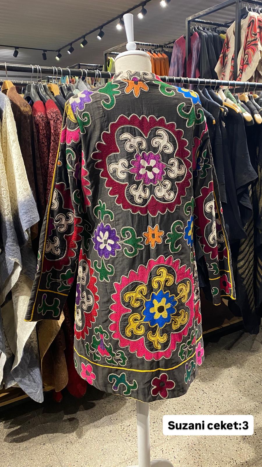 ÜRÜNLERİMİZ İPEK SUZANİDİR. ÜRÜNÜMÜZ ÖLÇÜLERİ OMUZ=41 BOY=59 KOL=59 EBATINDADIR.ÜRÜNÜMÜZ ÇİFT CEPLİDİR.ÜRÜNÜMÜZ ASTARLIDIR.EL YAPIMI ESKİ KUMAŞLARDAN ÜRETİLMİŞTİR.ÜRÜNÜMÜZ KİŞİYE ÖZEL TASARIMDIR.