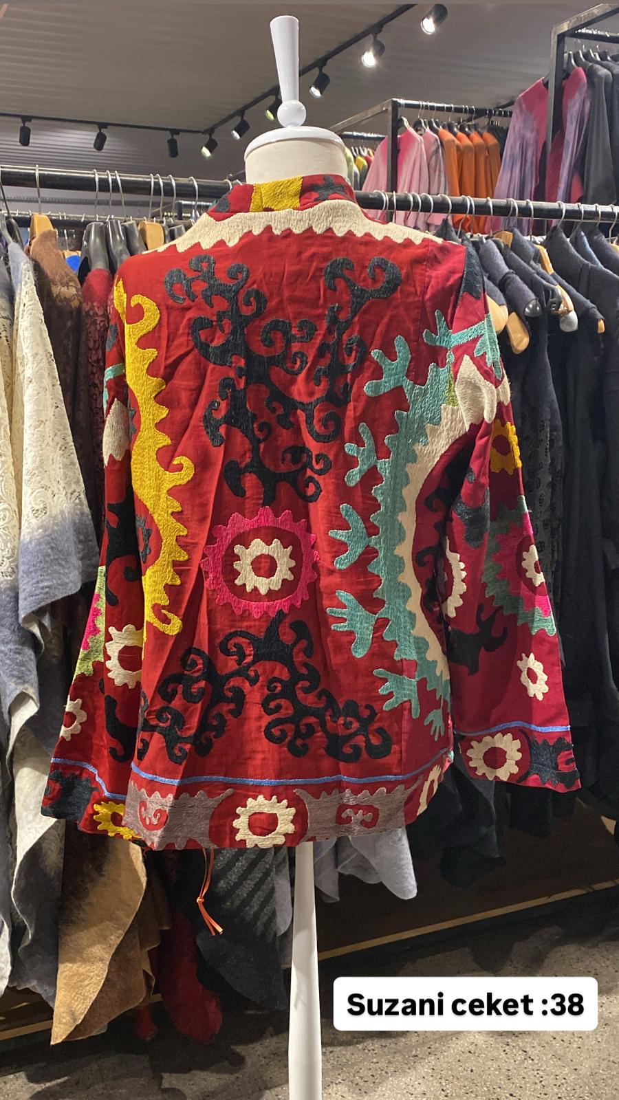 ÜRÜNLERİMİZ İPEK SUZANİDİR. ÜRÜNÜMÜZ ÖLÇÜLERİ OMUZ=42 BOY=56 KOL=59 EBATINDADIR.ÜRÜNÜMÜZ ÇİFT CEPLİDİR.ÜRÜNMÜZ ASTARLIDIR.EL YAPIMI ESKİ KUMAŞLARDAN ÜRETİLMİŞTİR.ÜRÜNÜMÜZ KİŞİYE ÖZEL TASARIMDIR.