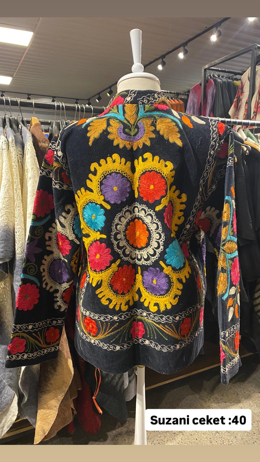 ÜRÜNLERİMİZ İPEK SUZANİDİR. ÜRÜNÜMÜZ ÖLÇÜLERİ OMUZ=41 BOY=59 KOL=59 EBATINDADIR.ÜRÜNÜMÜZ ÇİFT CEPLİDİR.ÜRÜNÜMÜZ ASTARLIDIR.EL YAPIMI ESKİ KUMAŞLARDAN ÜRETİLMİŞTİR.ÜRÜNÜMÜZ KİŞİYE ÖZEL TASARIMDIR.