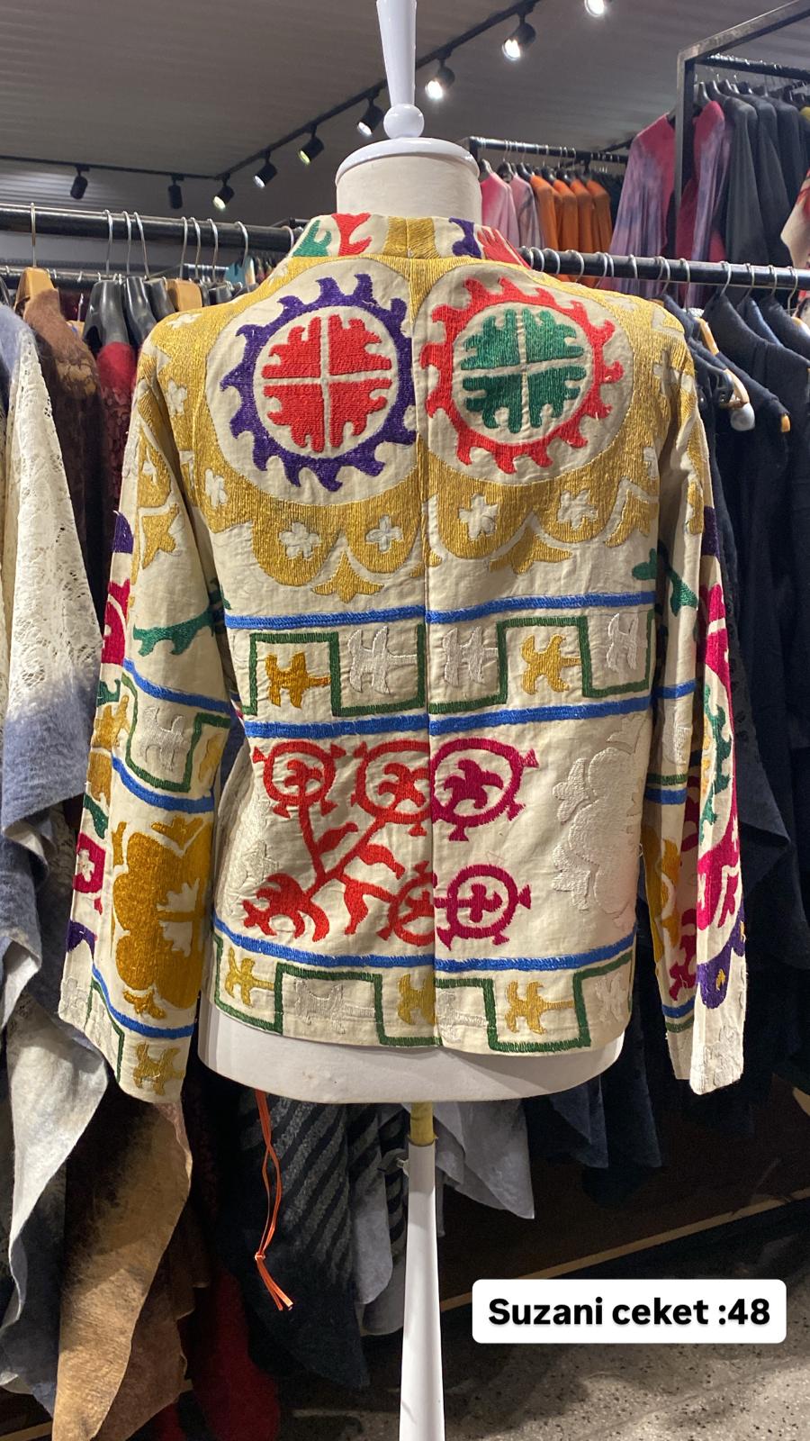 ÜRÜNLERİMİZ İPEK SUZANİDİR. ÜRÜNÜMÜZ ÖLÇÜLERİ OMUZ=41 BOY=73 KOL=46 EBATINDADIR.ÜRÜNÜMÜZ ASTARLIDIR.EL YAPIMI ESKİ KUMAŞLARDAN ÜRETİLMİŞTİR. ÜRÜNÜMÜZ KİŞİYE ÖZEL TASARIMDIR. ürün çok eski kumaşlardan kırkyama yapılarak sonra ceketolrak tasarlanmıştır