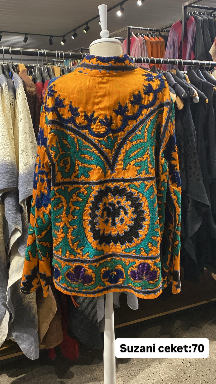 ÜRÜNLERİMİZ İPEK SUZANİDİR. ÜRÜNÜMÜZ ÖLÇÜLERİ OMUZ=45 BOY=66 KOL=59 EBATINDADIR.ÜRÜNÜMÜZ FERMUARLIDIR.EL YAPIMI ESKİ KUMAŞLARDAN ÜRETİLMİŞTİR.ÜRÜNÜMÜZ KİŞİYE ÖZEL TASARIMDIR.