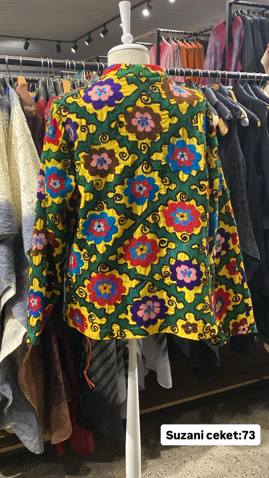 ÜRÜNLERİMİZ İPEK SUZANİDİR. ÜRÜNÜMÜZ ÖLÇÜLERİ OMUZ=42 BOY=56 KOL=59 EBATINDADIR.ÜRÜNÜMÜZ ÇİFT CEPLİDİR.ÜRÜNMÜZ ASTARLIDIR.EL YAPIMI ESKİ KUMAŞLARDAN ÜRETİLMİŞTİR.ÜRÜNÜMÜZ KİŞİYE ÖZEL TASARIMDIR.