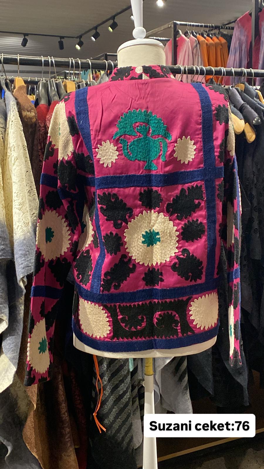 ÜRÜNLERİMİZ İPEK SUZANİDİR. ÜRÜNÜMÜZ ÖLÇÜLERİ OMUZ=45 BOY=66 KOL=59 EBATINDADIR.ÜRÜNÜMÜZ FERMUARLIDIR.EL YAPIMI ESKİ KUMAŞLARDAN ÜRETİLMİŞTİR.ÜRÜNÜMÜZ KİŞİYE ÖZEL TASARIMDIR.