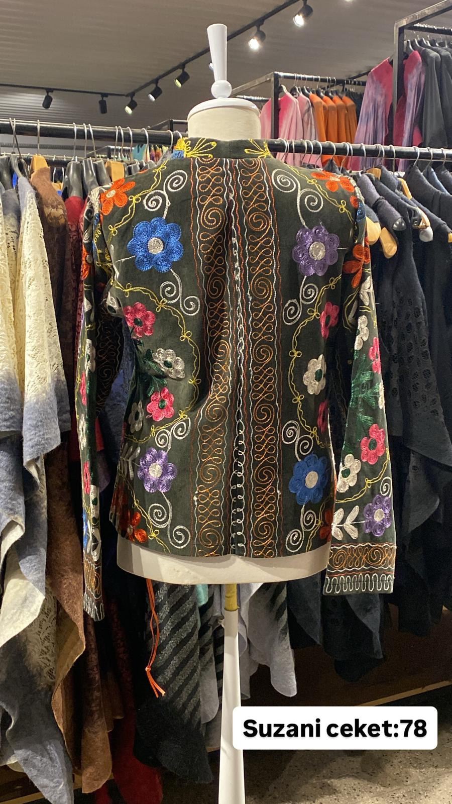 ÜRÜNLERİMİZ İPEK SUZANİDİR. ÜRÜNÜMÜZ ÖLÇÜLERİ OMUZ=36 BOY=58 KOL=53 EBATINDADIR.ÜRÜNÜMÜZ ÇİFT CEPLİDİR.ÜRÜNÜMÜZ ASTARLIDIR.EL YAPIMI ESKİ KUMAŞLARDAN ÜRETİLMİŞTİR.ÜRÜNÜMÜZ KİŞİYE ÖZEL TASARIMDIR.