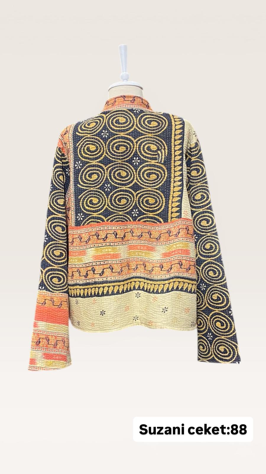 ÜRÜNLERİMİZ İPEK SUZANİDİR. ÜRÜNÜMÜZ ÖLÇÜLERİ OMUZ=40 BOY=76 KOL=58 EBATINDADIR.ÜRÜNÜMÜZ ASTARLIDIR.ÜRÜNÜMÜZ ÇİFT CEPLİDİR.EL YAPIMI ESKİ KUMAŞLARDAN ÜRETİLMİŞTİR.ÜRÜNÜMÜZ KİŞİYE ÖZEL TASARIMDIR.