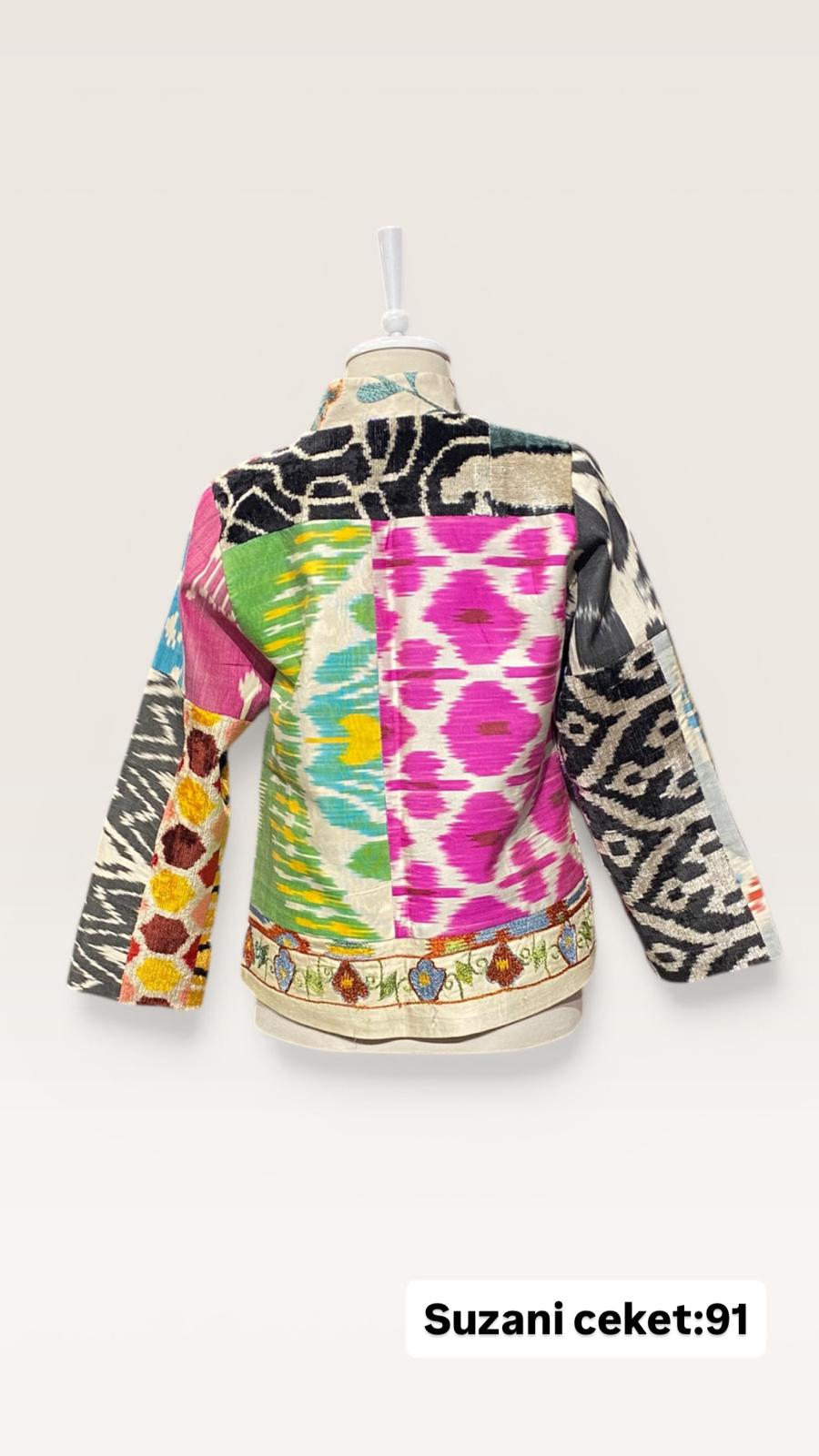 ÜRÜNLERİMİZ İPEK SUZANİDİR. ÜRÜNÜMÜZ ÖLÇÜLERİ OMUZ=41 BOY=73 KOL=46 EBATINDADIR.ÜRÜNÜMÜZ ASTARLIDIR.EL YAPIMI ESKİ KUMAŞLARDAN ÜRETİLMİŞTİR. ÜRÜNÜMÜZ KİŞİYE ÖZEL TASARIMDIR. ürün çok eski kumaşlardan kırkyama yapılarak sonra ceketolrak tasarlanmıştır