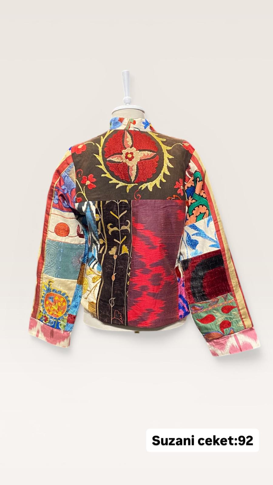 ÜRÜNLERİMİZ İPEK SUZANİDİR. ÜRÜNÜMÜZ ÖLÇÜLERİ OMUZ=41 BOY=73 KOL=46 EBATINDADIR.ÜRÜNÜMÜZ ASTARLIDIR.EL YAPIMI ESKİ KUMAŞLARDAN ÜRETİLMİŞTİR. ÜRÜNÜMÜZ KİŞİYE ÖZEL TASARIMDIR. ürün çok eski kumaşlardan kırkyama yapılarak sonra ceketolrak tasarlanmıştır