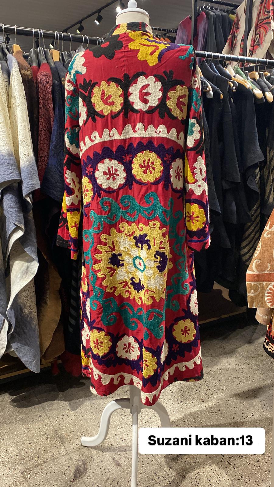 ÜRÜNLERİMİZ İPEK SUZANİDİR. ÜRÜNÜMÜZ ÖLÇÜLERİ OMUZ=40 BOY=83 KOL=59 EBATINDADIR. ÜRÜNÜMÜZ ÇİFT CEPLİDİR.ÜRÜNÜMÜZ ASTARLIDIR.EL YAPIMI ESKİ KUMAŞLARDAN ÜRETİLMİŞTİR ÜRÜNÜMÜZ KİŞİYE ÖZEL TASARIMDIR.