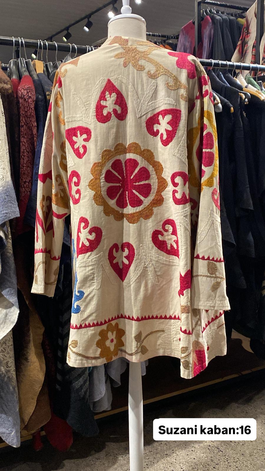 ÜRÜNLERİMİZ İPEK SUZANİDİR. ÜRÜNÜMÜZ ÖLÇÜLERİ OMUZ=42 BOY=64 KOL=60 EBATINDADIR.ÜRÜNÜMÜZ ASTARLIDIR.ÜRÜNÜMÜZ ÇİFT CEPLİDİR. EL YAPIMI ESKİ KUMAŞLARDAN ÜRETİLMİŞTİR ÜRÜNÜMÜZ KİŞİYE ÖZEL TASARIMDIR.