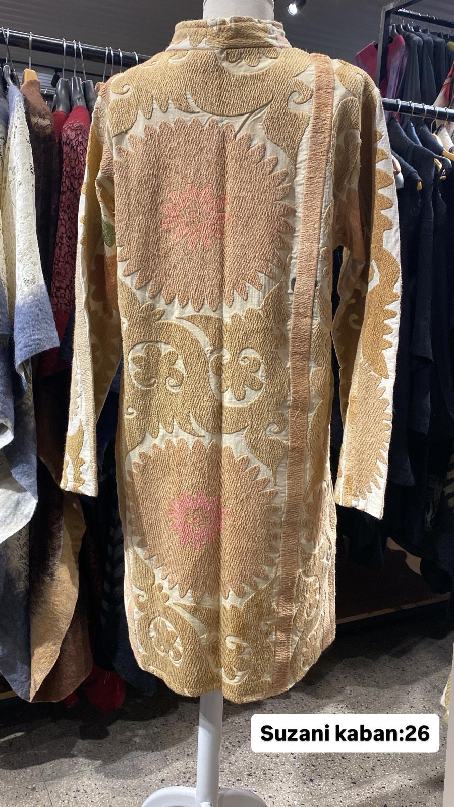 ÜRÜNLERİMİZ İPEK SUZANİDİR. ÜRÜNÜMÜZ ÖLÇÜLERİ OMUZ=42 BOY=64 KOL=60 EBATINDADIR.ÜRÜNÜMÜZ ASTARLIDIR.ÜRÜNÜMÜZ ÇİFT CEPLİDİR. EL YAPIMI ESKİ KUMAŞLARDAN ÜRETİLMİŞTİR ÜRÜNÜMÜZ KİŞİYE ÖZEL TASARIMDIR.
