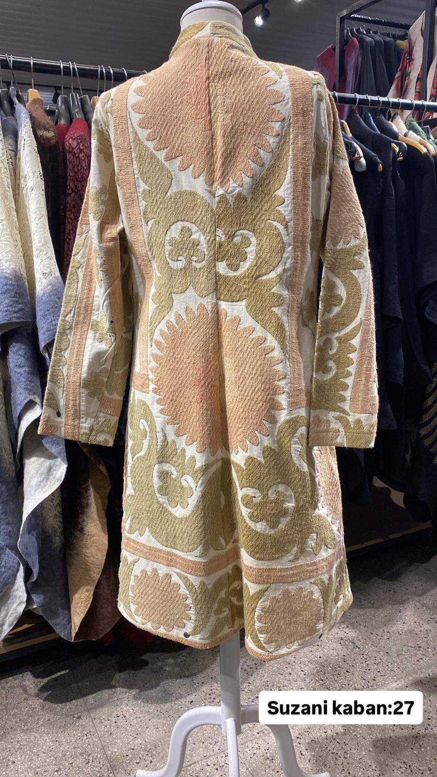 ÜRÜNLERİMİZ İPEK SUZANİDİR. ÜRÜNÜMÜZ ÖLÇÜLERİ OMUZ=40 BOY=83 KOL=59 EBATINDADIR. ÜRÜNÜMÜZ ÇİFT CEPLİDİR.ÜRÜNÜMÜZ ASTARLIDIR.EL YAPIMI ESKİ KUMAŞLARDAN ÜRETİLMİŞTİR ÜRÜNÜMÜZ KİŞİYE ÖZEL TASARIMDIR.