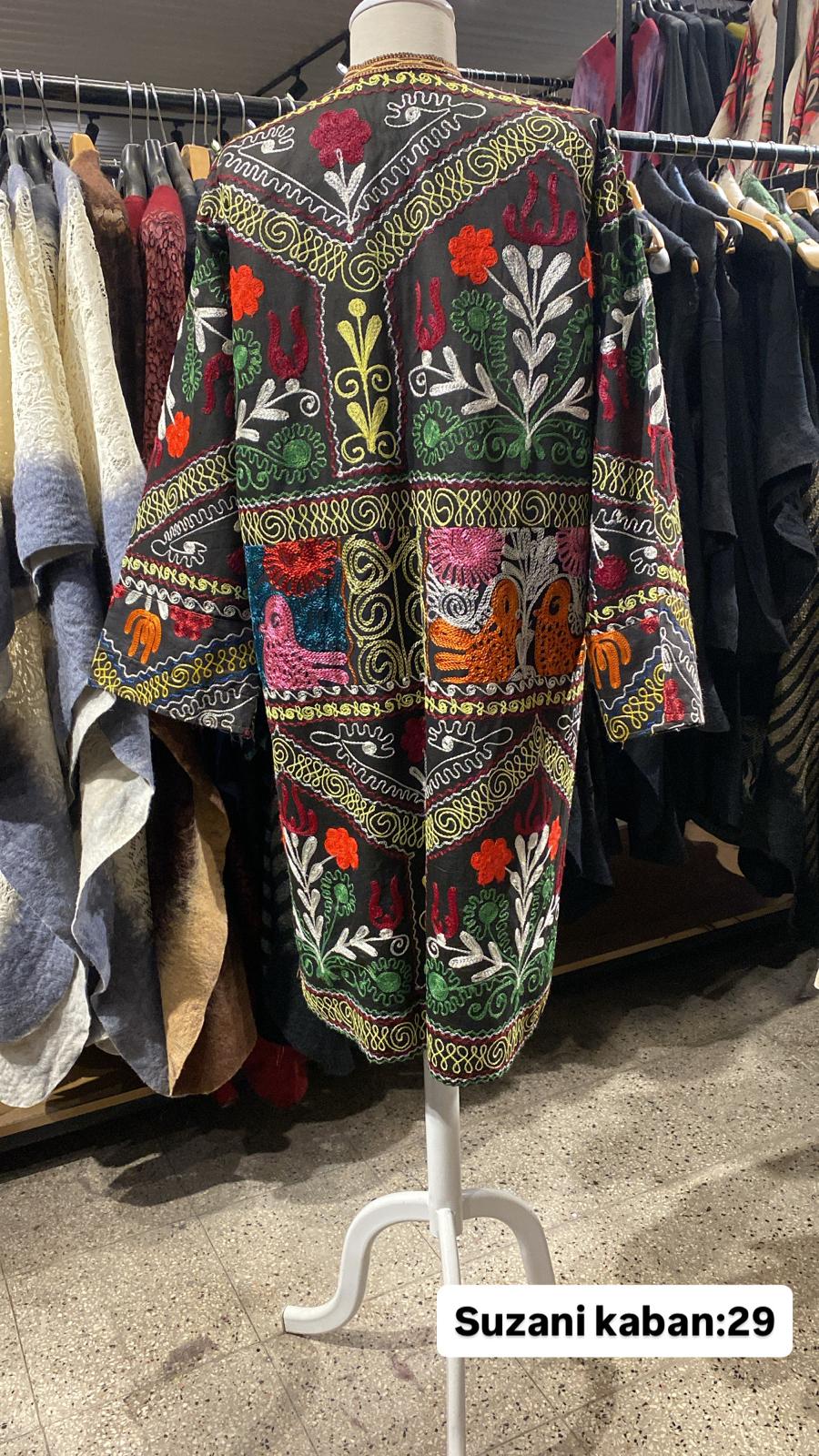 ÜRÜNLERİMİZ İPEK SUZANİDİR. ÜRÜNÜMÜZ ÖLÇÜLERİ OMUZ=40 BOY=83 KOL=59 EBATINDADIR. ÜRÜNÜMÜZ ÇİFT CEPLİDİR.ÜRÜNÜMÜZ ASTARLIDIR.EL YAPIMI ESKİ KUMAŞLARDAN ÜRETİLMİŞTİR ÜRÜNÜMÜZ KİŞİYE ÖZEL TASARIMDIR.