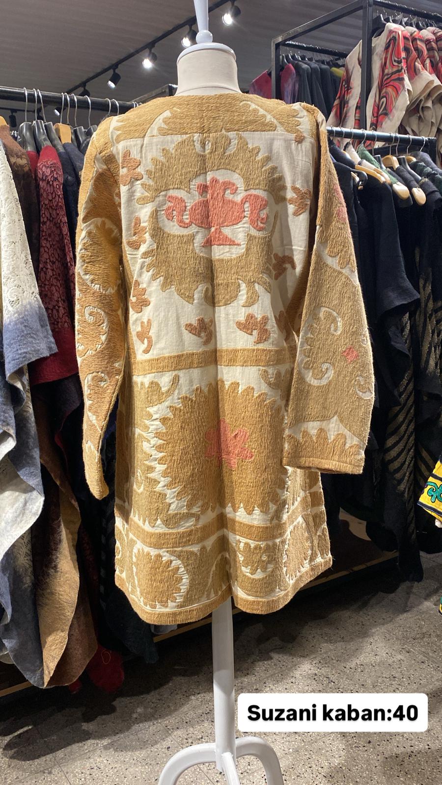ÜRÜNLERİMİZ İPEK SUZANİDİR. ÜRÜNÜMÜZ ÖLÇÜLERİ OMUZ=42 BOY=64 KOL=60 EBATINDADIR.ÜRÜNÜMÜZ ASTARLIDIR.ÜRÜNÜMÜZ ÇİFT CEPLİDİR. EL YAPIMI ESKİ KUMAŞLARDAN ÜRETİLMİŞTİR ÜRÜNÜMÜZ KİŞİYE ÖZEL TASARIMDIR.