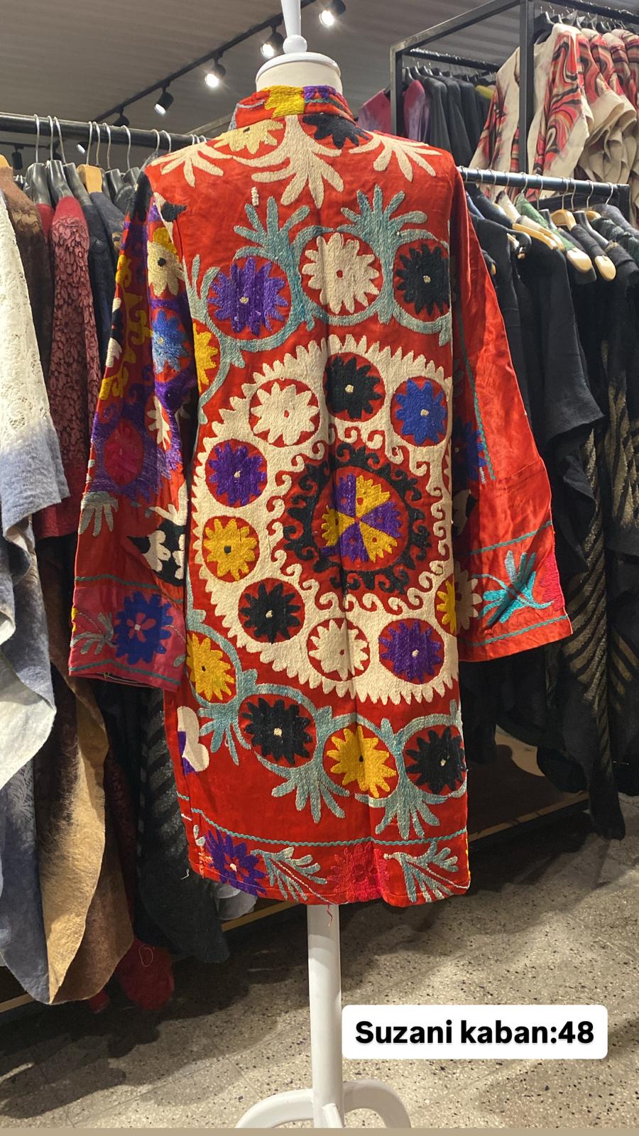 ÜRÜNLERİMİZ İPEK SUZANİDİR. ÜRÜNÜMÜZ ÖLÇÜLERİ OMUZ=40 BOY=83 KOL=59 EBATINDADIR. ÜRÜNÜMÜZ ÇİFT CEPLİDİR.ÜRÜNÜMÜZ ASTARLIDIR.EL YAPIMI ESKİ KUMAŞLARDAN ÜRETİLMİŞTİR ÜRÜNÜMÜZ KİŞİYE ÖZEL TASARIMDIR.