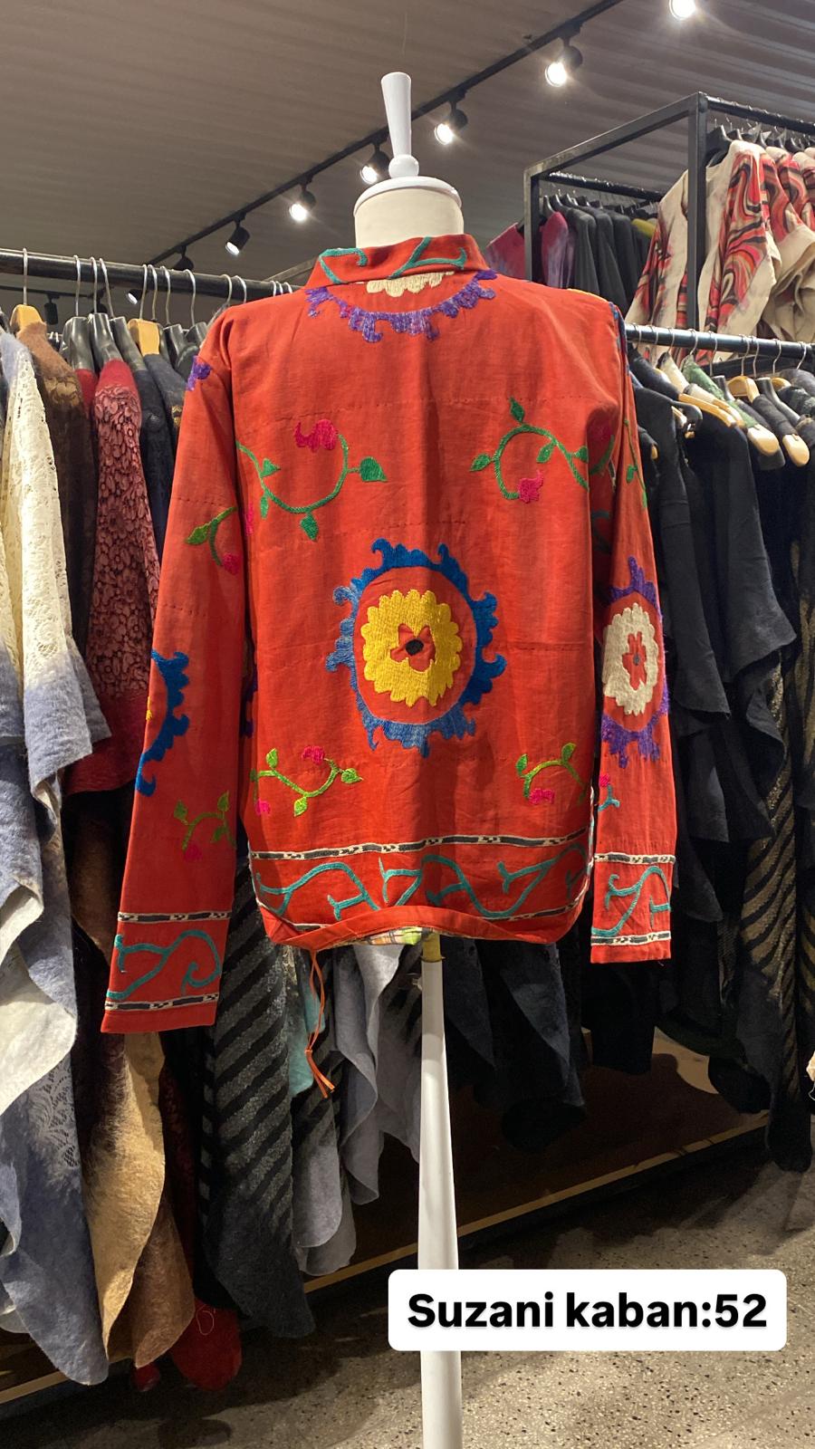 ÜRÜNLERİMİZ İPEK SUZANİDİR. ÜRÜNÜMÜZ ÖLÇÜLERİ OMUZ=42 BOY=64 KOL=60 EBATINDADIR.ÜRÜNÜMÜZ ASTARLIDIR.ÜRÜNÜMÜZ ÇİFT CEPLİDİR. EL YAPIMI ESKİ KUMAŞLARDAN ÜRETİLMİŞTİR ÜRÜNÜMÜZ KİŞİYE ÖZEL TASARIMDIR.