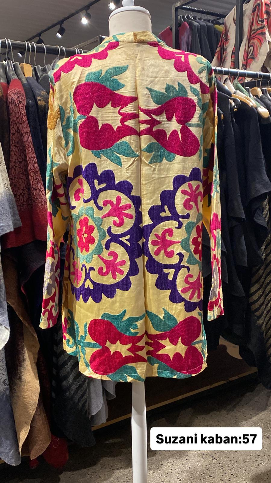 ÜRÜNLERİMİZ İPEK SUZANİDİR. ÜRÜNÜMÜZ ÖLÇÜLERİ OMUZ=42 BOY=64 KOL=60 EBATINDADIR.ÜRÜNÜMÜZ ASTARLIDIR.ÜRÜNÜMÜZ ÇİFT CEPLİDİR. EL YAPIMI ESKİ KUMAŞLARDAN ÜRETİLMİŞTİR ÜRÜNÜMÜZ KİŞİYE ÖZEL TASARIMDIR.