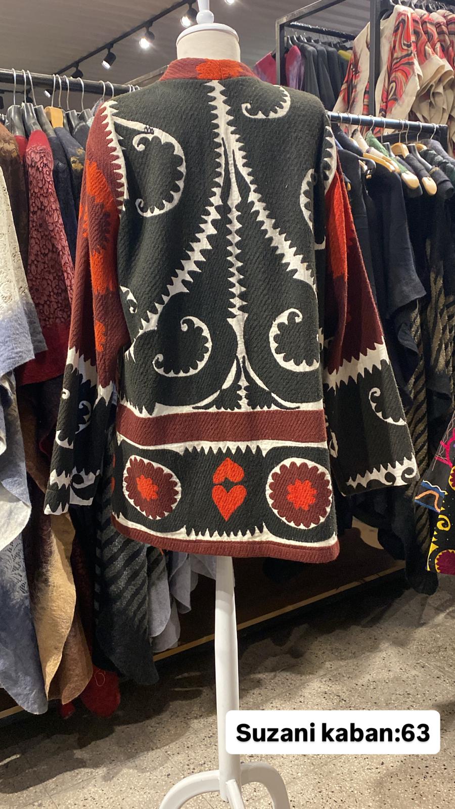 ÜRÜNLERİMİZ İPEK SUZANİDİR. ÜRÜNÜMÜZ ÖLÇÜLERİ OMUZ=42 BOY=64 KOL=60 EBATINDADIR.ÜRÜNÜMÜZ ASTARLIDIR.ÜRÜNÜMÜZ ÇİFT CEPLİDİR. EL YAPIMI ESKİ KUMAŞLARDAN ÜRETİLMİŞTİR ÜRÜNÜMÜZ KİŞİYE ÖZEL TASARIMDIR.