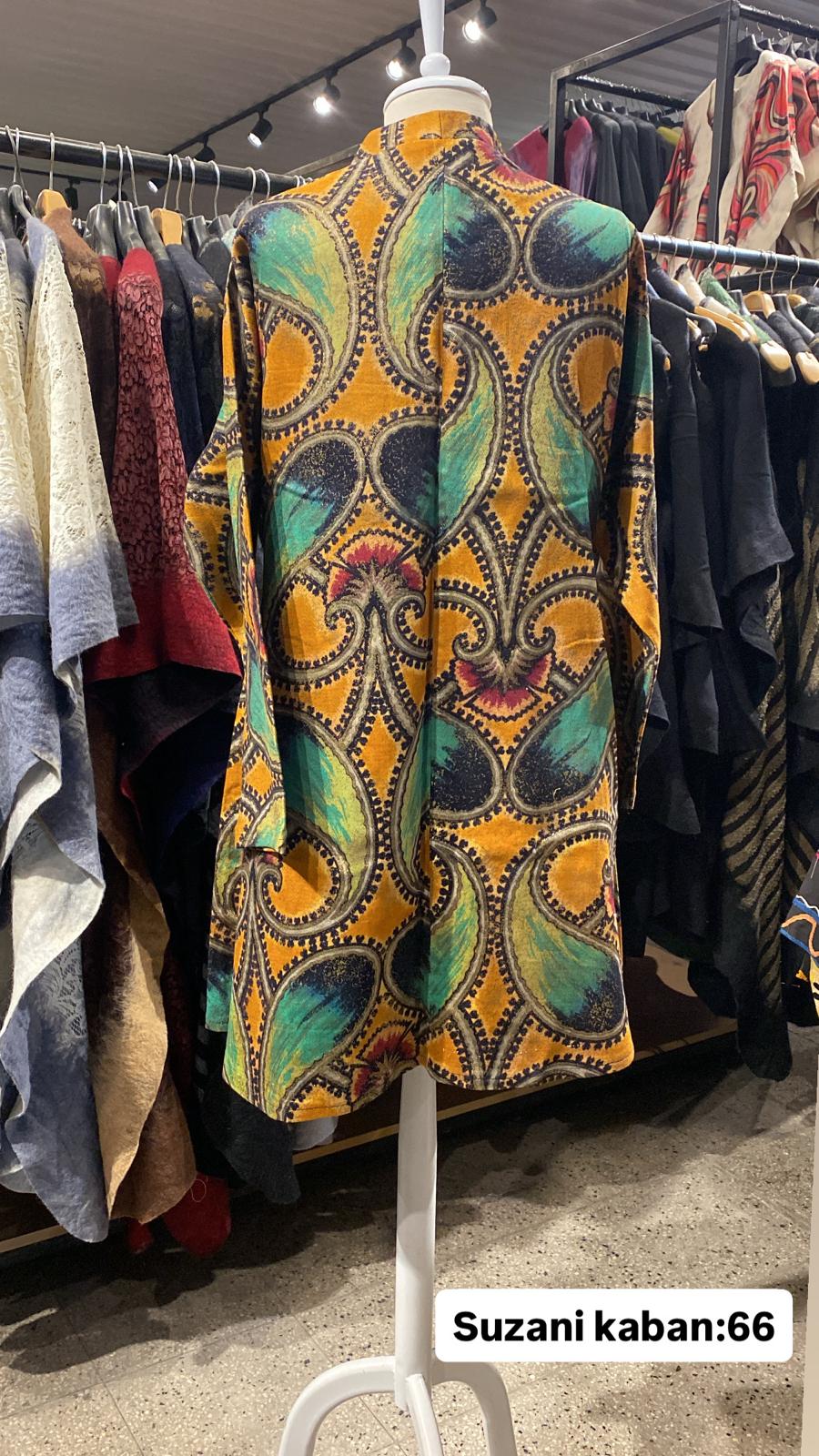 ÜRÜNLERİMİZ İPEK SUZANİDİR. ÜRÜNÜMÜZ ÖLÇÜLERİ OMUZ=42 BOY=64 KOL=60 EBATINDADIR.ÜRÜNÜMÜZ ASTARLIDIR.ÜRÜNÜMÜZ ÇİFT CEPLİDİR. EL YAPIMI ESKİ KUMAŞLARDAN ÜRETİLMİŞTİR ÜRÜNÜMÜZ KİŞİYE ÖZEL TASARIMDIR.