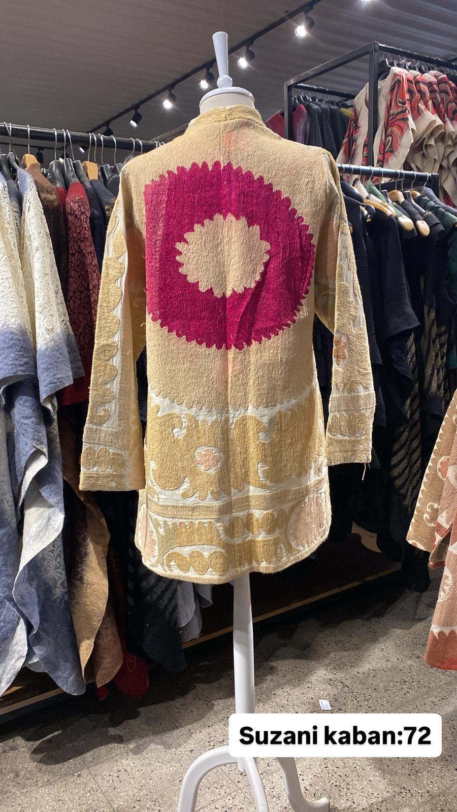 ÜRÜNLERİMİZ İPEK SUZANİDİR. ÜRÜNÜMÜZ ÖLÇÜLERİ OMUZ=42 BOY=64 KOL=60 EBATINDADIR.ÜRÜNÜMÜZ ASTARLIDIR.ÜRÜNÜMÜZ ÇİFT CEPLİDİR. EL YAPIMI ESKİ KUMAŞLARDAN ÜRETİLMİŞTİR ÜRÜNÜMÜZ KİŞİYE ÖZEL TASARIMDIR.