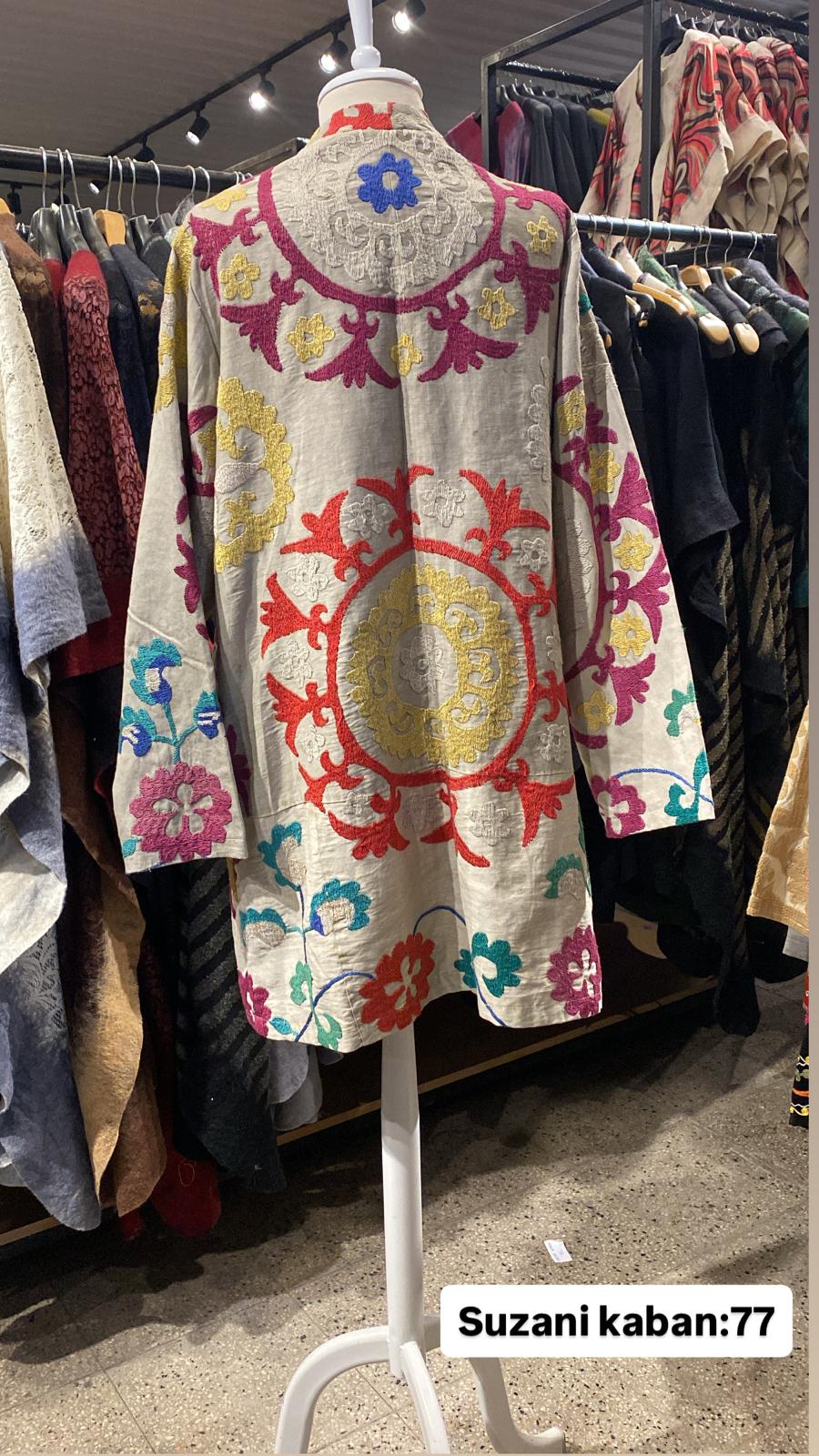 ÜRÜNLERİMİZ İPEK SUZANİDİR. ÜRÜNÜMÜZ ÖLÇÜLERİ OMUZ=42 BOY=64 KOL=60 EBATINDADIR.ÜRÜNÜMÜZ ASTARLIDIR.ÜRÜNÜMÜZ ÇİFT CEPLİDİR. EL YAPIMI ESKİ KUMAŞLARDAN ÜRETİLMİŞTİR ÜRÜNÜMÜZ KİŞİYE ÖZEL TASARIMDIR.