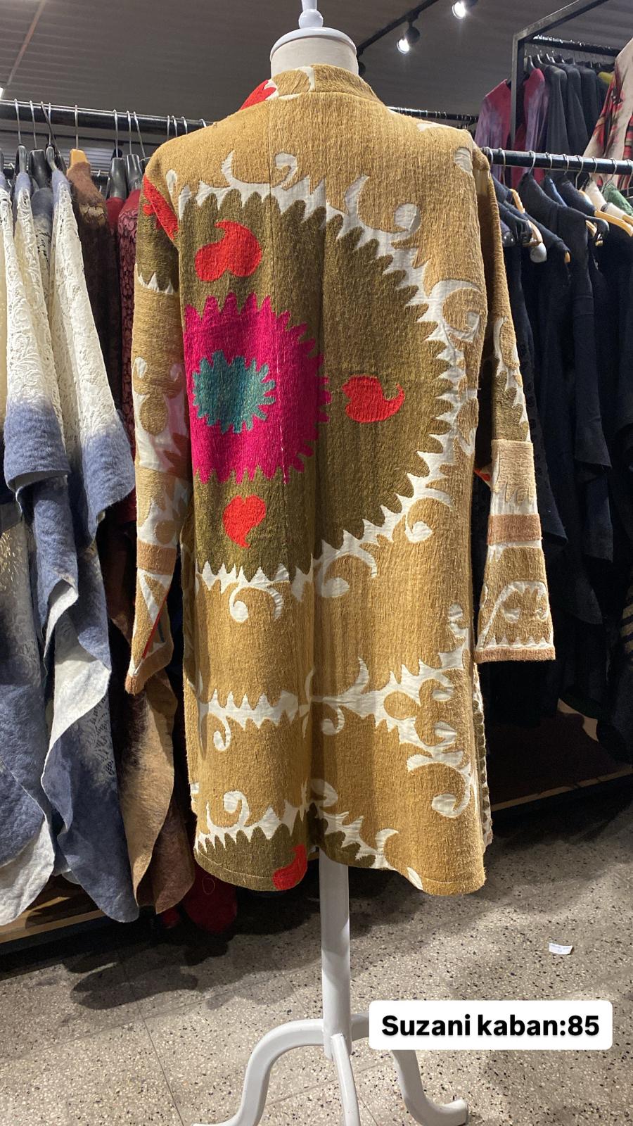 ÜRÜNLERİMİZ İPEK SUZANİDİR. ÜRÜNÜMÜZ ÖLÇÜLERİ OMUZ=42 BOY=64 KOL=60 EBATINDADIR.ÜRÜNÜMÜZ ASTARLIDIR.ÜRÜNÜMÜZ ÇİFT CEPLİDİR. EL YAPIMI ESKİ KUMAŞLARDAN ÜRETİLMİŞTİR ÜRÜNÜMÜZ KİŞİYE ÖZEL TASARIMDIR.