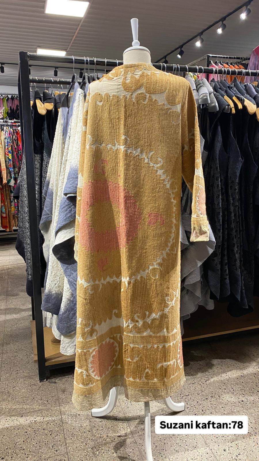 ÜRÜNLERİMİZ İPEK SUZANİDİR. ÜRÜNÜMÜZ ÖLÇÜLERİ OMUZ=35 BOY=120 KOL=59 EBATINDADIR. ÜRÜNÜMÜZ ASTARLIDIR. ÜRÜNÜMÜZ KUŞAKLIDIR.EL YAPIMI ESKİ KUMAŞLARDAN ÜRETİLMİŞTİR ÜRÜNÜMÜZ KİŞİYE ÖZEL TASARIMDIR.